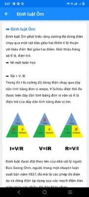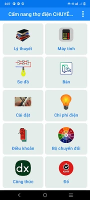 Hành trình khám phá điện học của bạn được xây dựng trên bốn trụ cột kiến thức chính. Phần "Lý thuyết" cung cấp cái nhìn sâu sắc về mọi thiết bị và hệ thống điện, từ nhà ở, nhà máy đến các công trình chính phủ. Bạn sẽ dễ dàng nắm bắt các nguyên lý cơ bản như điện áp, dòng điện, điện trở, định luật Ohm, và cách thức lắp đặt, sửa chữa từng bước. Chuyển sang "Máy tính", đây là bộ công cụ đắc lực với các tính năng tính toán đa dạng như định luật Ohm, kích thước dây dẫn, sụt áp hay tuổi thọ pin, cùng với các bảng chuyển đổi hữu ích, giúp bạn có được những tham chiếu nhanh chóng và kết quả chính xác tuyệt đối.