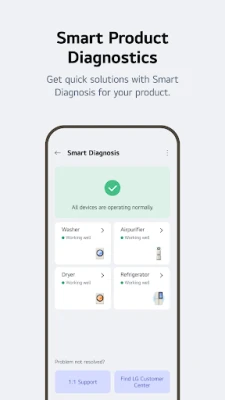 Sự an tâm của bạn là ưu tiên hàng đầu, và LG ThinQ đảm bảo rằng mọi vấn đề đều được giải quyết nhanh chóng. Chức năng "Chẩn đoán thông minh" cho phép bạn kiểm tra tình trạng hoạt động của thiết bị LG ngay lập tức, xác định các vấn đề tiềm ẩn. Nếu cần hỗ trợ chuyên sâu hơn, việc đặt lịch hẹn với kỹ sư chuyên nghiệp của LG để chẩn đoán và kiểm tra chính xác chỉ trong vài thao tác đơn giản. Ngoài ra, bạn có thể dễ dàng truy cập thư viện hướng dẫn sử dụng toàn diện cho tất cả các thiết bị gia dụng LG, với đầy đủ mô tả chức năng và giải pháp hữu ích, ngay trong ứng dụng, biến LG ThinQ thành trung tâm quản lý toàn diện cho ngôi nhà hiện đại của bạn.