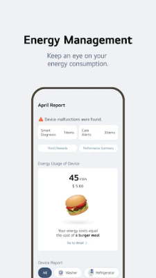 Không chỉ dừng lại ở điều khiển từ xa, LG ThinQ còn là trợ thủ đắc lực trong việc tối ưu hóa năng lượng. Với tính năng "Quản lý năng lượng", bạn có thể theo dõi chi tiết mức tiêu thụ của các thiết bị gia đình, so sánh với các hộ gia đình lân cận và thiết lập mục tiêu tiết kiệm rõ ràng. Ứng dụng sẽ gửi thông báo tình trạng sử dụng, giúp bạn chủ động hơn trong việc giảm thiểu chi phí sinh hoạt và góp phần bảo vệ môi trường, biến mỗi ngày thành một trải nghiệm sống thông minh và hiệu quả hơn.