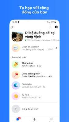 Mở rộng vòng kết nối xã hội của bạn một cách linh hoạt. Nhanh chóng thêm bạn bè mới bằng cách quét mã QR trên Messenger hoặc chia sẻ mã của riêng bạn. Hòa mình vào các cộng đồng sôi động có chung sở thích, từ trường học đến khu phố, tạo nên những mối quan hệ ý nghĩa. Luôn cập nhật thông tin mới nhất từ các nhà sáng tạo nội dung yêu thích bằng cách tham gia kênh thông báo của họ, nơi chia sẻ những câu chuyện đời thường và chân thực. Thể hiện cá tính độc đáo của bạn qua Tin và Ghi chú, những khoảnh khắc và suy nghĩ nhanh chóng được chia sẻ và tự động biến mất sau 24 giờ. Mang cảm xúc vào mọi cuộc đối thoại với vô vàn nhãn dán động, GIF vui nhộn và biểu tượng cảm xúc đa dạng. Cá nhân hóa không gian chat của bạn với bộ sưu tập chủ đề phong phú, liên tục được bổ sung, lấy cảm hứng từ nhiều nguồn khác nhau.