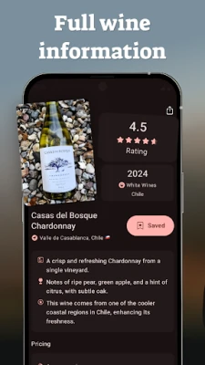 Tìm kiếm loại rượu vang hoàn hảo của bạn với Wine ID. Ứng dụng nhận diện rượu vang được hỗ trợ bởi AI này cho phép bạn quét nhãn để khám phá thông tin chi tiết về lịch sử, hương vị và xuất xứ. Dễ dàng hỏi về giá cả, rượu tương tự và tìm nơi mua gần bạn.